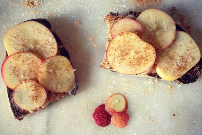 Basically, spread some good sourdough toast thickly with tahini, layer on some thin (thin) slices of fresh apple, and then sprinkle it all with ground cinnamon and crunchy Maldon salt.